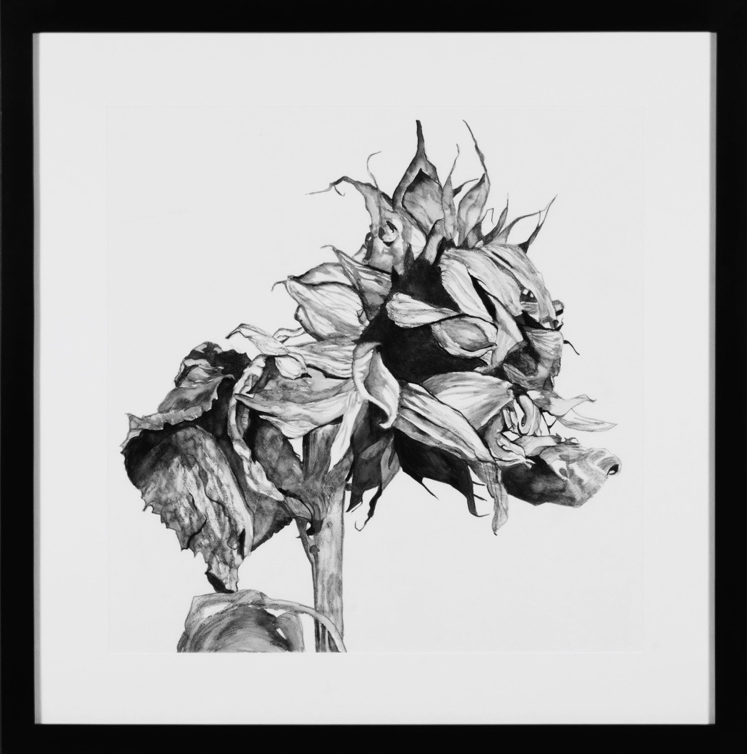 Transitions 5 Brown, C. (2017). Sunflower Portrait Series; Transitions #5 of 7, Chinese ink on Arches watercolor paper, 36” x 36”